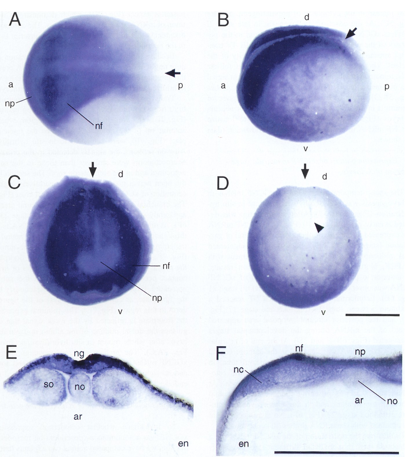 area (arrowhead in D). a, anterior; p, posterior; d, dorsal; v, ventral. Bar, 0.5 mm. (E,F) In situ hybridization with xGCNF antisense RNA on 100 pm