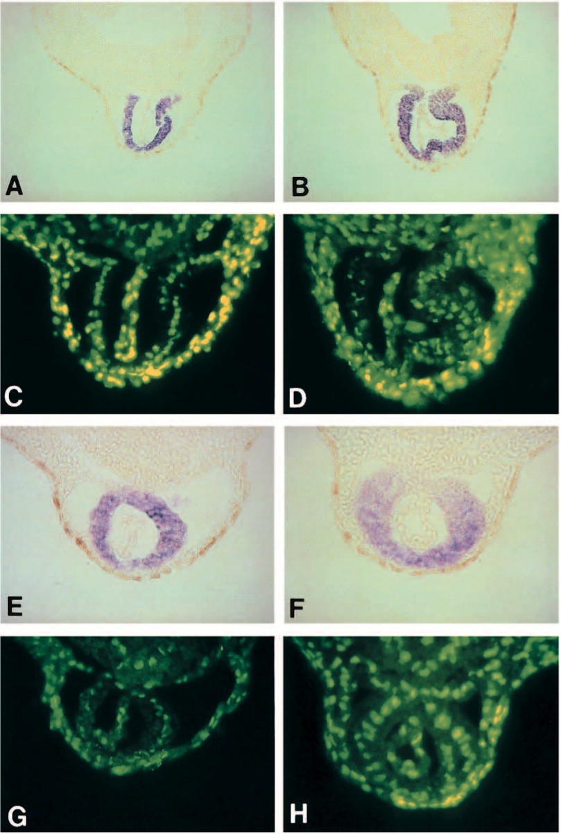 Fig. 4. Paraffin sections demonstrate an increase in myocardial volume and in the number of myocardial cells in XNkx-2.3 and XNkx-2.5 injected embryos. In situ hybridization to detect cardiac troponin I transcripts (the purple color in A,B,E,F) was completed before sectioning. Nuclei were visualized in C,D,G, and H with the fluorescent nuclear stain SYTOX Green (Molecular Probes). (A) Cross section through the heart region of a water injected embryo at stage 33. (B) Section equivalent to that in A from a XNkx- 2.5 injected embryo. (C) Section adjacent to that in A. (D) Section adjacent to that in B. (E) Cross section through the heart region of a water injected embryo at stage 31. (F) Section equivalent to E from a XNkx-2.3-injected embryo. (G) Same section as in E. (H) Same section as in F. A-B were photographed at 00. C-H were photographed at 00.