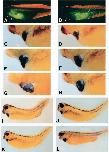 Fig. 1. XNkx-2.3 and XNkx-2.5 are expressed in similar regions of the developing embryo. In situ hybridization with antisense XNkx-2.3 and XNkx-2.5 probes demonstrates that both of these sequences are expressed in early heart progenitors (h) and are maintained in cardiac tissue throughout development. XNkx-2.3 and XNkx-2.5 are also expressed in similar, but distinct regions of anteriorendoderm (e) and pharynx (p). (A) Stage 18 XNkx-2.5 stained embryo. (B) Stage 18 XNkx-2.3 stained embryo. (C) Stage 28 embryos. (D) Stage 37 embryos. In C and D the XNkx-2.3 stained embryo is on top.