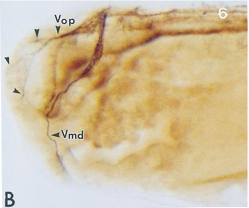 FIG. 6. Inhibition of cranial nerve development by NF-MDT. Embryos were injected unilaterally with either NF-MDT mRNA (A)or b-galactosidase mRNA (E, F) at the 2-cell stage and then immunostained with the anti-MAP1 antibody as wholemounts at stage 28 (A and B) or stage 37/38 (C ). (A, C, and E) The side of the animal derived from the injected blastomere. (B, D, and F) The respective contralateral uninjected side of the same animals. At stage 28, Vop (A, labeled arrowhead) developed to a lesser extent than on the contralateral, uninjected side (B). The unlabeled arrowheads in B show additional segments of Vop that are missing from the injected side. At stage 37/38 (C), cranial nerve development was more dramatically inhibited. (C) Inhibition of cranial nerves Vop, Vmd, VII, IX, and X. (D) Normal development of these same nerves on the contralateral side. Xb, Xv , and Xl are especially well developed on this side compared to the injected side. (E and F) Cranial nerve development was unaffected by expression of b-galactosidase. Cranial nerves on both sides of the head developed symmetrically, and the extent of nerve development was similar to that in D. (The dorsal side of the animals shown in E and F is rotated slightly forward.) Abbreviations: E, eye; O, otic vesicle; Vop , ophthalmic branch of the trigeminal nerve; Vmd, mandibular branch of the trigeminal nerve; VII, branch of the facial nerve; IX, branch of the glossopharyngeal nerve; Xb , brachial branch of the Xth cranial nerve; Xv visceral branch of Xth cranial nerve; Xl lateral line branch of the Xth cranial nerve. The scale bar applies to all panels.