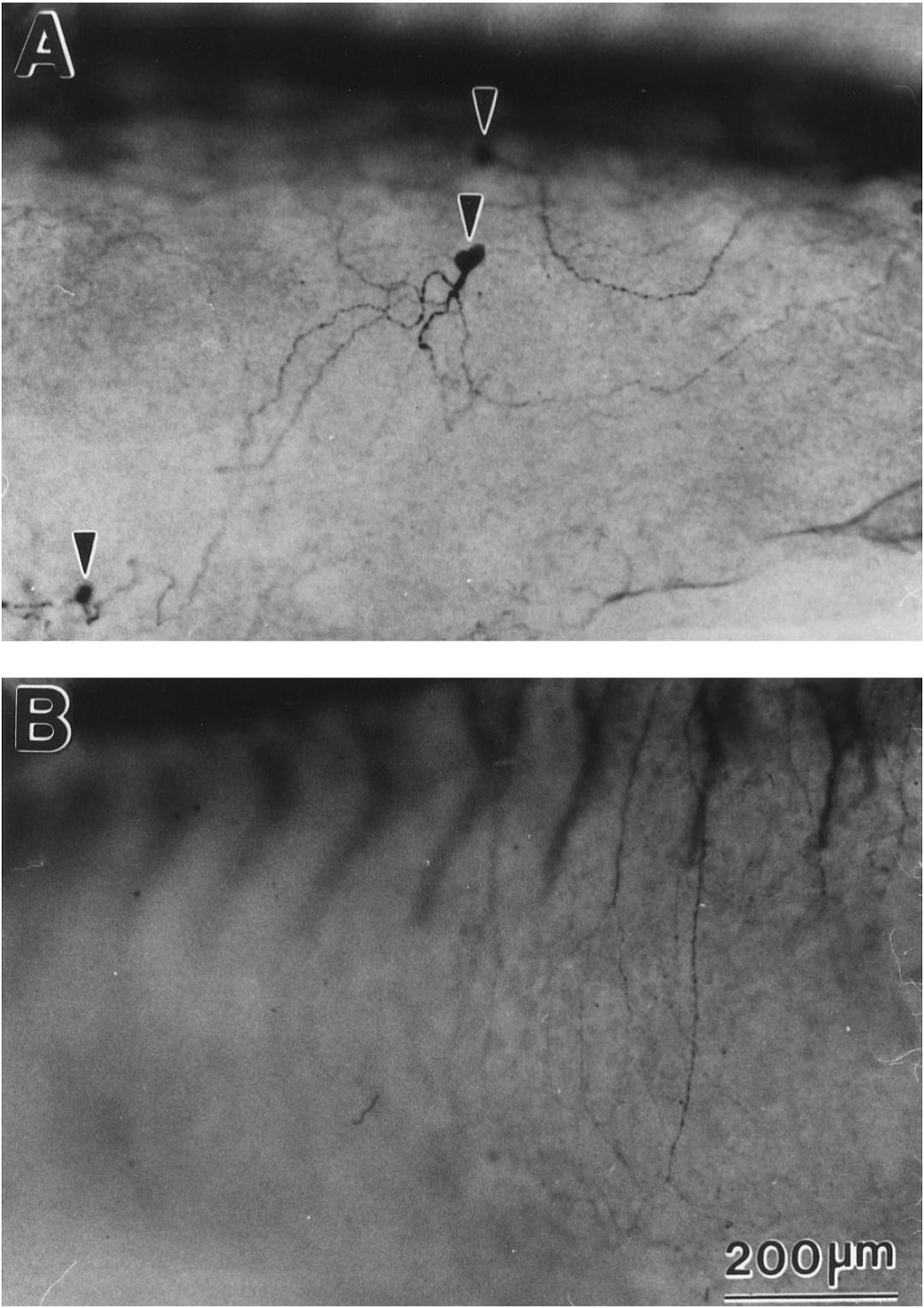 FIG. 8. The presence of ectopic neurons in the trunks of tadpoles expressing NF-MDT. 2-cell stage embryos were injected unilater-ally with NF-MDT mRNA and then stained as wholemounts at neustage 37/38 with the anti-NF-M tail antibody (RMO270, 1:200). Several ectopic cells with neuronal morphologies appeared on the injected side of the tadpole (arrowheads in A). These cells were absent from the uninjected side (B). The scale is the same for both panels.
