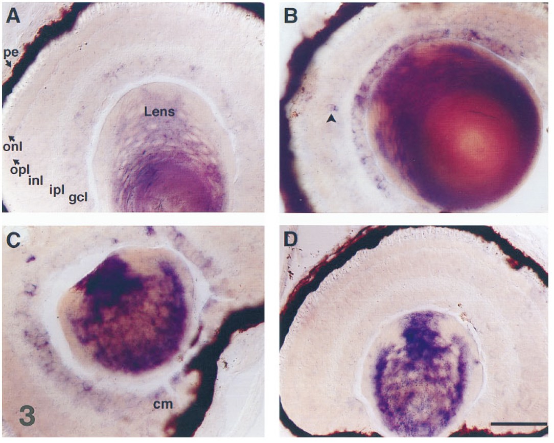 bodies in the ganglion cell layer (gcl) and the ciliary margin cells (cm). In some stage 45 retinal sections, one to two digoxygenin-labeled