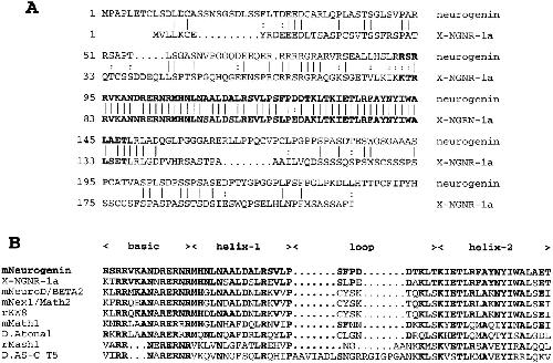 (A) Alignment of the entire predicted amino acid sequences of rat NEUROGENIN and a Xenopus NEUROGENIN-related protein, X-NGNR-1.a. The bHLH region is marked in bold type. Solid lines indicate amino acid identity; the dots, conservative substitutions. The initiator methionine was selected based on Kozak's rules (Kozak 1984) and identification of in-frame up-stream termination codons (data not shown).
