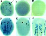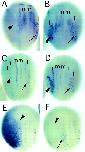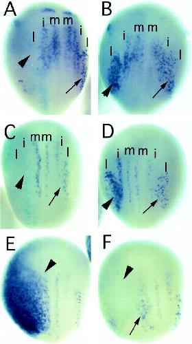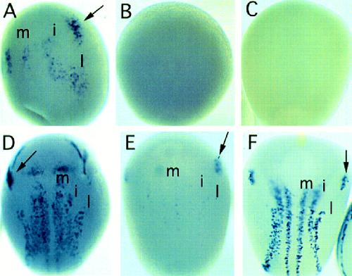A series of embryos at St. 12 (A–C) and St. 13–13.5 (D and E) and St. 14 (F) are shown, hybridized with probes for X-ngnr-1 (A and D), XNeuroD (B and E) and N-tubulin (C and F). Note that X-ngnr-1 is expressed prior to both XNeuroD and N-tubulin, in patches that define the three prospective territories of primary neurogenesis (A, m, i, and l). Arrows in (A) and (D)–(F) indicate trigeminal placode (A) or ganglia (D–F). Note also that at St. 13.5, the domain of X-ngnr-1 expression within the m, i, and l regions of the neural plate is larger than the domain of either XNeuroD or N-tubulin expression.