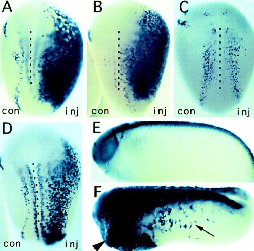 Ectopic neurogenesis was visualized in St. 13.5 (neural plate stage) embryos by whole mount in situ hybridization with an N-tubulin probe (A and D). Embryos were injected on one side (inj) with either X-ngnr-1 (A and B) or XNeuroD (C and D) synthetic RNA. X-NGNR-1 induced ectopic neurogenesis (A) as well as expression of endogenous XNeuroD (B); XNeuroD also induced ectopic neurogenesis (D) but did not induce X-ngnr-1 (C). No ectopic expression of N-tubulin was observed in lacZ RNA-injected embryos (E). At the tail bud stage (F), ectopic neurogenesis is induced by X-NGNR-1 in the skin (arrow) and the entire anterior region (arrowhead). A similar phenotype is seen in XNeuroD-injected embryos at this stage ( Lee et al. 1995; and data not shown).
