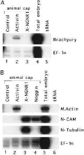 Neither of two mesodermal markers, Xenopus brachyury (A) and muscle-specific actin (M.Actin) (B), is induced in animal caps cultured from embryos injected with X-ngnr-1 RNA (A and B, lanes 3), whereas both are induced in positive control caps cultured with activin (A and B, lanes 2). In contrast, X-NGNR-1 induces expression of both NCAM and N-tubulin (B, lane 3). For comparison, caps injected with noggin RNA express NCAM but not N-tubulin (B, lane 4). Elongation factor-1α (EF-1α) serves as a control for RNA loading ( Ferreiro et al. 1994). âTotal embryoâ indicates total RNA from embryos of the equivalent stage (St. 11 for [A], St. 15â16 for [B]); âtRNAâ indicates carrier tRNA control, while âControlâ animal caps represents RNA from animals caps cultured from uninjected embryos.