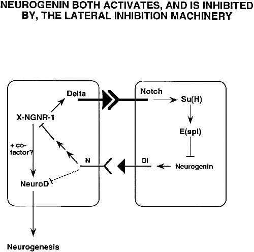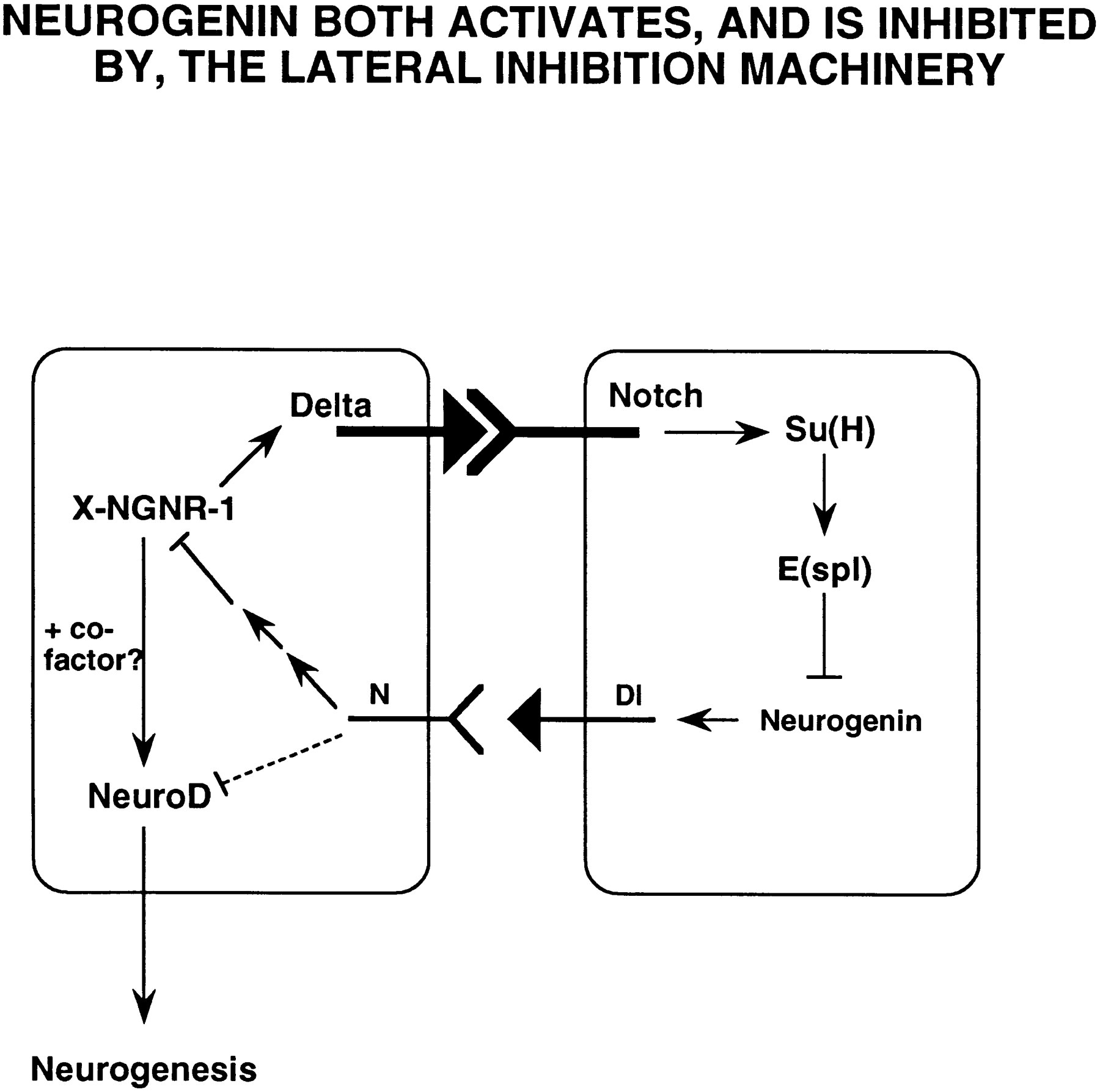 The model draws heavily on analogies to Drosophila (Ghysen et al. 1993). X-NGNR-1 initially activates expression of X-Delta-1 and is inhibited by signaling through X-Notch (left side of diagram). The inhibition of X-ngnr-1 expression may be mediated by Suppressor of Hairless [Su(H)] and enhancer of split [E(spl)] proteins, by analogy to Drosophila ( Artavanis-Tsakonas et al. 1995). Expression of X-NGNR-1 above a certain threshhold, or in the presence of a hypothetical cofactor (see text), leads to expression of XNeuroD and neuronal differentiation in a manner insensitive to inhibition by Notch signaling (dashed blunt arrow) ( Chitnis and Kintner 1996).
