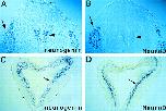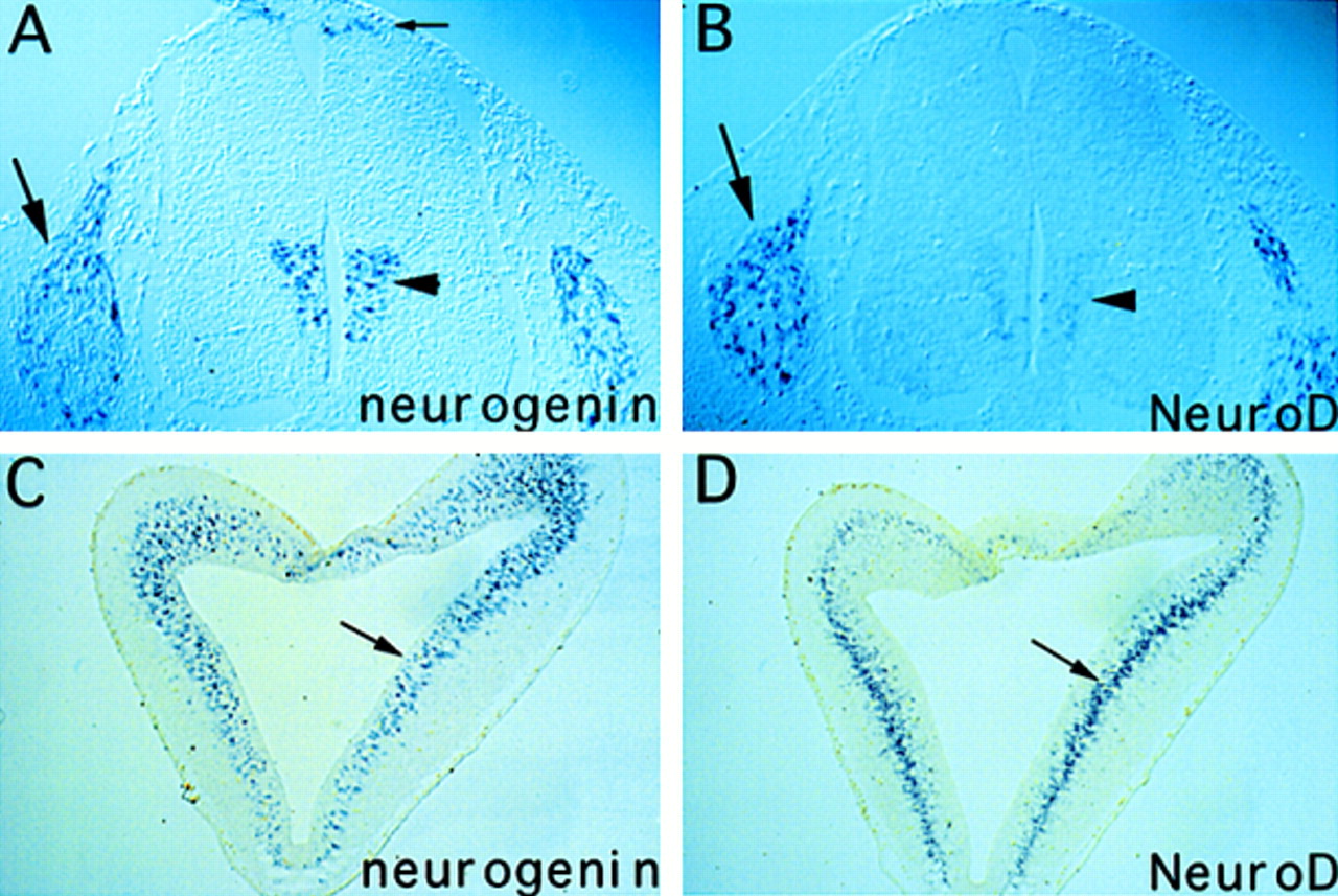 Adjacent transverse sections of E13.5 rat trunk spinal cord (A and B) and tangential sections of E14.5 forebrain (top part) (C and D). Arrows in (A) and (B) indicate dorsal root sensory ganglia; no signal was detected in sympathetic or other autonomic ganglia (data not shown). Note that neurogenin and NeuroD are expressed in similar regions (arrowheads, A and B), but that NeuroD is displaced lateral to the ventricular zone where NEUROGENIN is expressed (arrows, C and D).