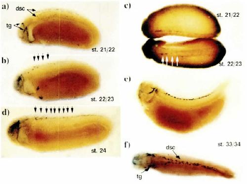 34. respectively. Ie) Dorsal view of uncleared stage 21/22 and 22/23 embryos. (f) Dorsal view of cleared stage 33134 embryo. The early dorsal spinal cord (dsc) and trigemmal ganglia (tg) areindicated. Shadedarrows indicateregularity in the patterns of expression wIthin the dsc at the earlierstages.