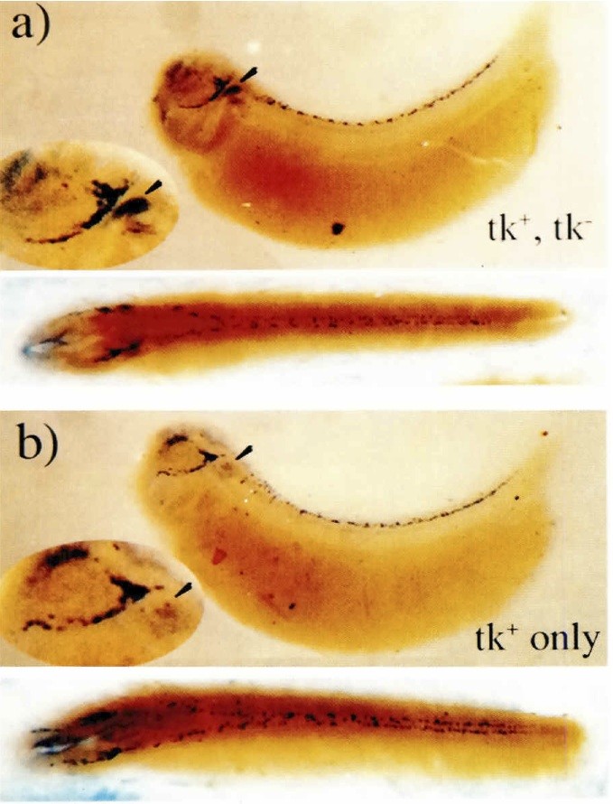 Fig. 8. Comparison of stage 33/34 embryos hybridized with probes detecting {al the catalytic and non-catalytic (JA, tk+.tk-)and(bl only the catalytic rH. tk+) forms of the xTrk,8 mRNA. Both lateral and dorsal \'ieW5 are shown for each embryo. The insert
