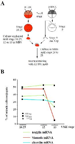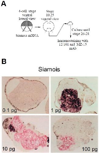 Fig. 3. Effects of the overexpression of Siamois in embryonic ventralmesodermtissue. (A) Diagrammatic representation of the