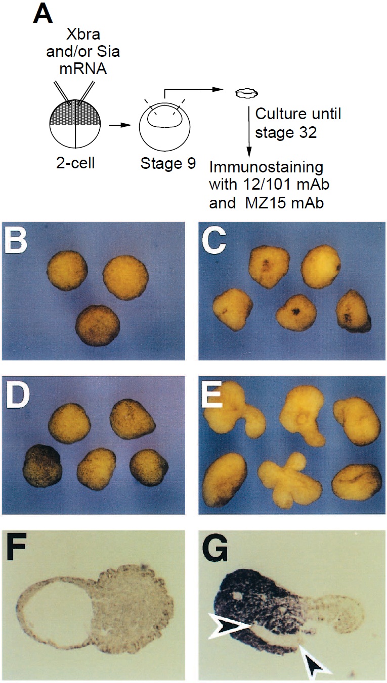 caps overexpressing Xbra (F) or Xbra and Siamois (G), cultured until
