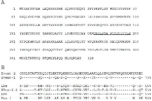 (A) Deduced amino acid sequence of Xvent-2 protein. The homeodomain is