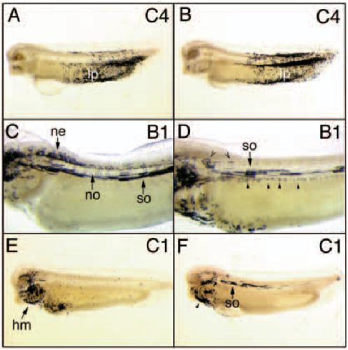 arches, appearing more clustered instead (arrowheads in F). hm, head mesoderm; lp, lateral plate; ne, neural tissue; no, notochord; so, somites.