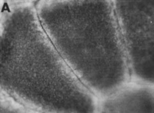 Cgn (cingulin) gene expression in Xenopus laevis embryos, NF stage 7, as assayed by immunohistochemistry. View of tight junctions between blastomeres.