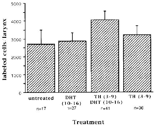 FIG. 4. The effects of hormone treatments on laryngeal cell proliferation in PM2 juveniles. The number of labeled cells/total number