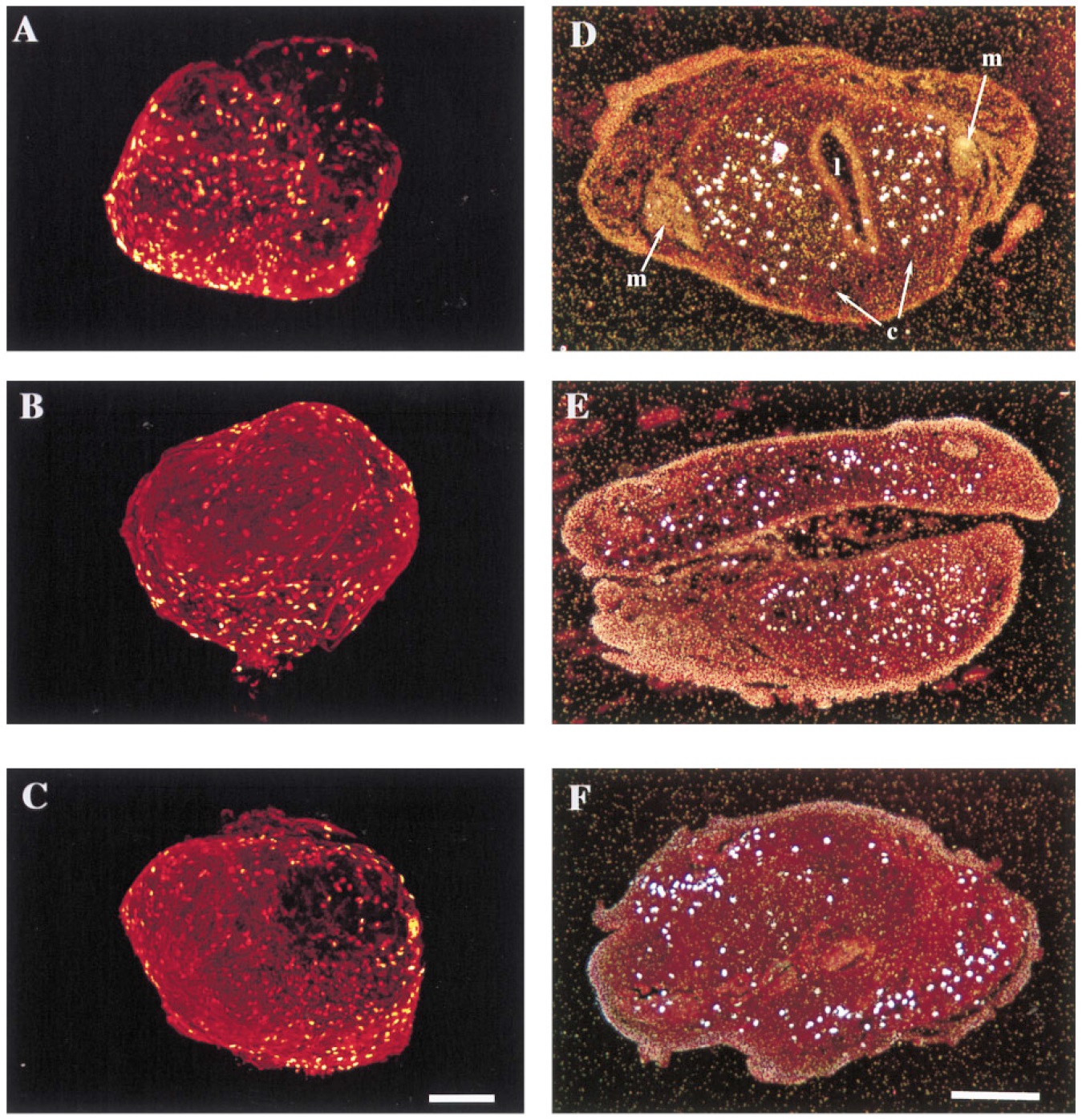 or TH/DHT-treated (C, F). Bar, 100 mm. Abbreviations: m, muscle; c, cartilage; l, lumen.