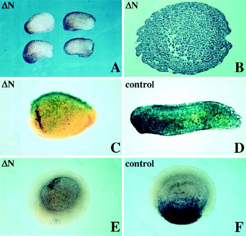 (A–D) Embryos allowed to develop until sibling stage 27. Anterior is to the left. (A) shows phenotypes of embryos injected with 250 pg of ΔN RNA in both dorsal blastomeres at the 4-cell stage. (B) shows a horizontal section of an embryo as in (A), with blastopore to the right.