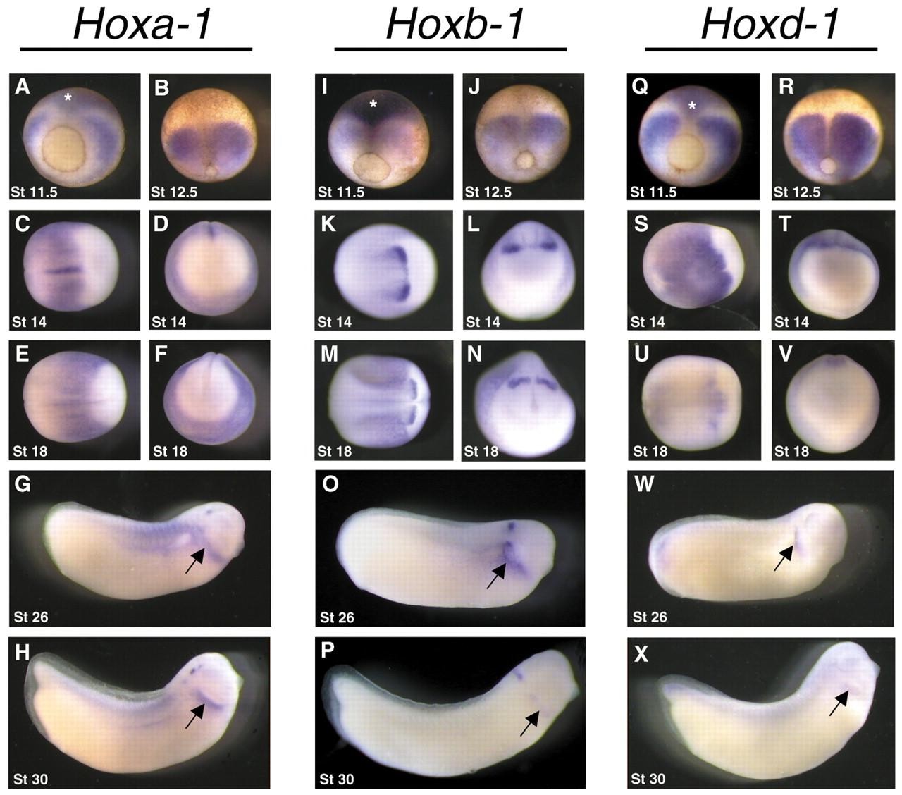 Fig. 1. Hox PG1 genes have overlapping expression domains during Xenopus laevis development. Hoxa1 (A-H), Hoxb1 (I-P) and Hoxd1 (Q-X) have overlapping expression patterns. Gastrula stage embryos (A,B,I,J,Q,R) are shown from the vegetal side, dorsal up. When compared with Otx-2 expression (* in A,I,Q), it can be seen that the Hox expression does not reach the presumptive midbrain region. Neurula embryos are shown from the dorsal side, anterior to the right (C,E,K,M,S,U) or from the anterior side, dorsal up (D,F,L,N,T,V). Later embryos are shown from the lateral side, anterior to the right (G,H,O,P,W,X). Note pharyngeal arch expression of all three PG1 genes (arrows in G,H,O,P,W,X).