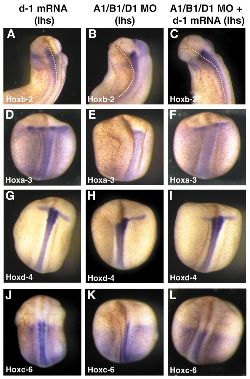 Fig. 7. Hoxd1 mRNA rescues Hox expression in PG1 knockdown embryos. Embryos injected on the left-hand side (lhs) with Hoxd1 MO insensitive mRNA (A,D,G,J), all three PG1 morpholinos (B,E,H,K) or a combination of both (C,F,I,L) were analysed for expression of Hoxb2, Hoxa3, Hoxd4 and Hoxc6. Embryos are shown from the dorsal side, anterior to the top. Hoxb2 expression was expanded posteriorly with Hoxd1 mRNA (A: 75%, n=12), lost with the triple PG1 morpholinos (B: 93%, n=28) and rescued when a combination was injected (C: 48% of embryos had downregulated expression, n=33). The other Hox genes were not affected by the Hoxd1 mRNA overexpression. PG1 MO downregulated expression of Hoxa3 (E: 78%, n=9), Hoxd4 (H: 100%, n=9) and Hoxc6 (K: 78%, n=9) and in the rescues this downregulation was reduced to 34%, 20% and 33% for Hoxa3, Hoxd4 and Hoxc6, respectively (F,I,L).