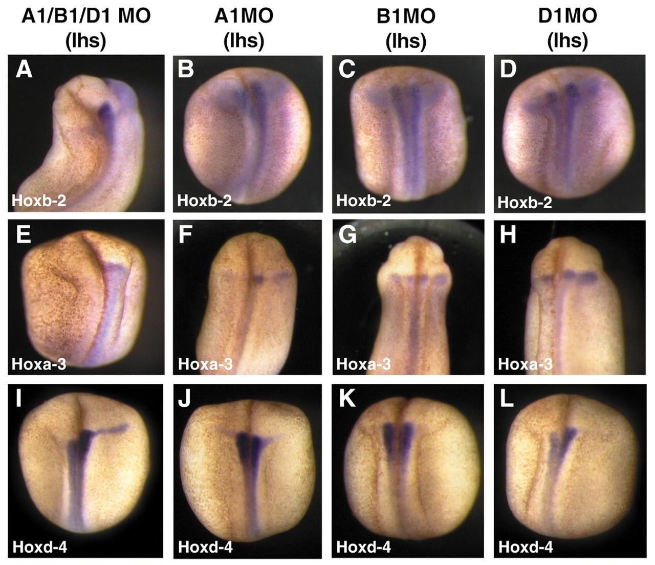 Fig. 8. Effects of single PG1 knockdowns on Hox genes. Embryos injected on the left-hand side (lhs) with the triple PG1 MO combination had reduced Hoxb2 (A: 93%, n=28), Hoxa3 (E: 100%, n=14) and Hoxd4 (I: 79%, n=14). The Hoxa1 MO weakly downregulated Hoxb2 (B: 80%, n=10) and reduced Hoxa3 (F: 54%, n=11), but not Hoxd4 (J: 100%, n=20). The Hoxb1 MO had no effect on any of these genes (C: Hoxb2, 100%, n=10; G: Hoxa3, 100% n=9; K: Hoxd4, 100%, n=18). Hoxd1 MO reduced Hoxd4 expression (L: 100%, n=16), weakly reduced Hoxb2 (D: 43%, n=14), but did not affect Hoxa3 (H: 100%, n=10).