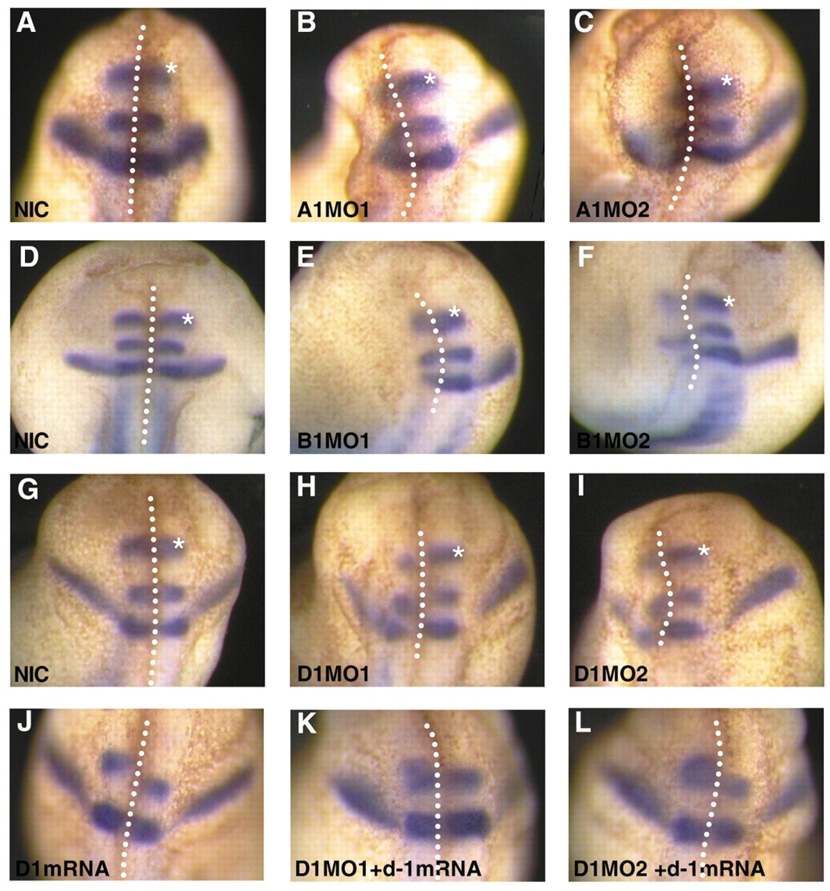 Fig. 2. Specificity of PG1 morpholinos. Two morpholinos for each Hox PG1 gene were injected into the left-hand side of the embryo and Krox20 (r3 and r5) and Engrailed-2 (midbrain/hindbrain boundary: * in A-I) expression analysed. The hindbrain region of early tailbud stage embryos (anterior to the top) is shown for non injected controls (NIC; A,D,G), Hoxa1 1st (B: 80%, n=15) and 2nd (C: 70%, n=10) morpholinos, Hoxb1 1st (E: 85%, n=13) and 2nd (F: 70%, n=20) morpholinos and Hoxd1 1st (H: 90%, n=11) and 2nd (I: 80%, n=15) morpholinos. Overexpression of Hoxd1 morpholino insensitive RNA (J) and rescue of Hoxd1 1st and 2nd morpholinos with Hoxd1 RNA is also shown (K,L). Dotted line indicates the midline.