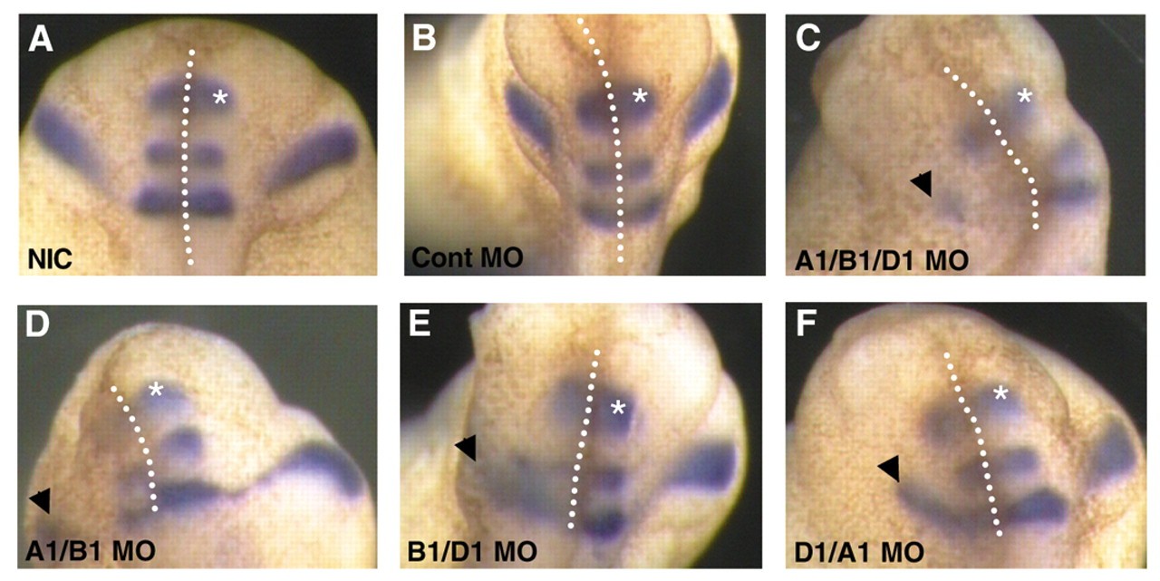 Fig. 3. The triple PG1 knockdown phenotype is more severe than the double knockdowns. Morpholinos for each Hox PG1 gene were injected either in double (D: A1/B1 52%, n=25; E: B1/D1 48%, n=29; F: D1/A1 64%, n=33) or triple (C: A1/B1/D1 94%, n=35) combinations into the left-hand side of the embryo and Krox20 and Engrailed-2 (*) expression analysed. The hindbrain region of early tailbud stage embryos is shown, with anterior to the top. Non-injected controls (NIC; A), and embryos injected on the left-hand side of the embryo with control morpholino (B) are also shown. Arrowheads indicate neural crest expression.