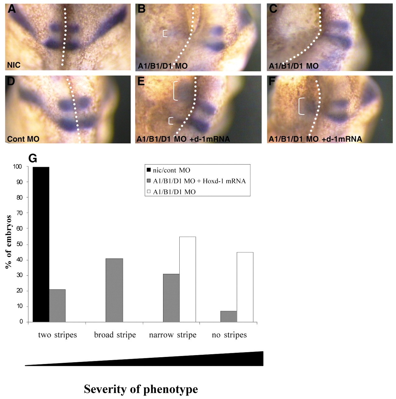 Fig. 4. Hoxd1 mRNA can partially rescue the triple PG1 morpholino phenotype. Early tailbud stage embryos were injected on the left-hand side (lhs) with all three PG1 morpholinos (A1/B1/D1 MO) either alone (B,C), or in combination with Hoxd1 mRNA (E,F). Non-injected controls (NIC) and control morpholino (Cont MO) are also shown (A,D). Anterior is to the top. G: Krox-20 expression is partially rescued by Hoxd1 RNA. Numbers of embryos with two stripes (E), one broad stripe (F), one narrow stripe (B) or no stripes (C) of Krox20 expression were scored. Co-injection of Hoxd1 RNA partially rescued the Krox20 expression (n=29), which was either absent or very much reduced in embryos injected only with A1/B1/D1MO (n=18).