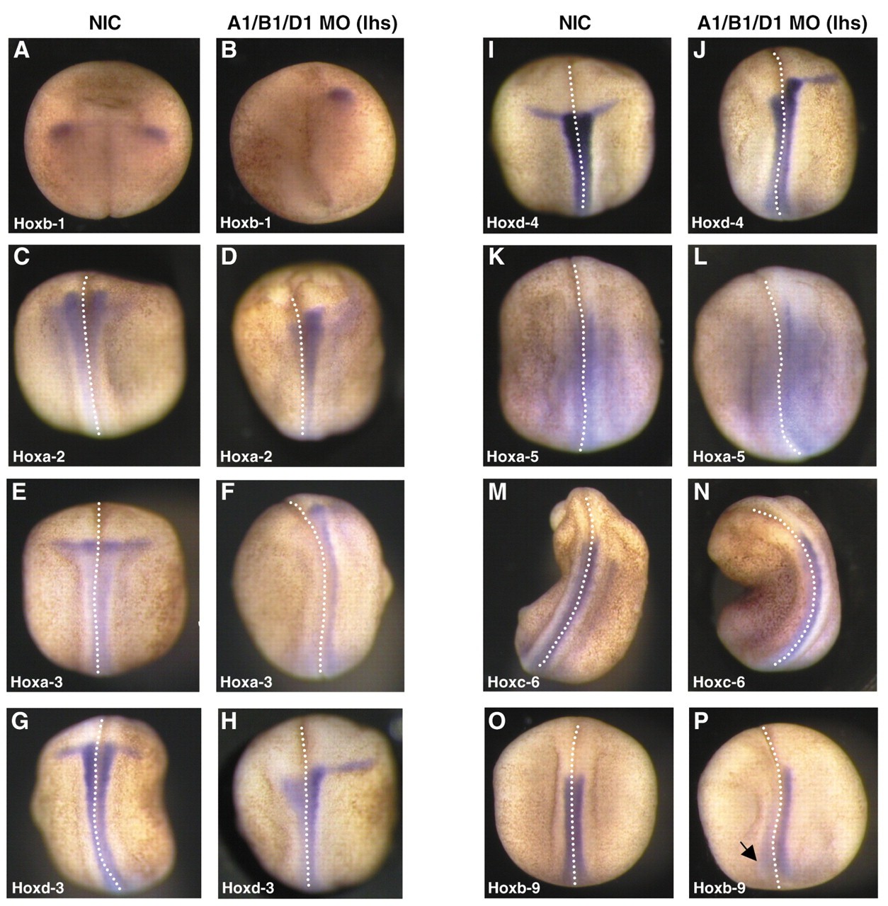 Fig. 6. Knockdown of all three PG1 genes affects more posterior Hox genes. Non injected controls (NIC; A,C,E,G,I,K,M,O) and embryos injected on the left-hand side (lhs) with all three Hox PG1 morpholinos (A1/B1/D1MO; B,D,F,H,J,L,N,P) were analysed for Hox gene expression at early tailbud stage. Embryos are shown from the dorsal side, anterior to the top. Hoxb1 expression was lost (A,B: 70%, n=10), and Hoxa2 (C,D: 100%, n=18) and Hoxa3 (E,F: 100%, n=14) expression was almost completely absent. Hoxd3 (G,H: 68%, n=19) and Hoxd4 (I,J: 79%, n=14) neural tube expression was still present, but the pharyngeal arch expression was lost. The more posterior Hox genes (Hoxa5, K,L: 100%, n=10; Hoxc6, M,N: 71%, n=14; Hoxb9, O,P: 93%, n=14) had reduced neural tube expression in the anterior part of the embryo but their posterior expression domains (arrow) and mesodermal expression were unaffected.