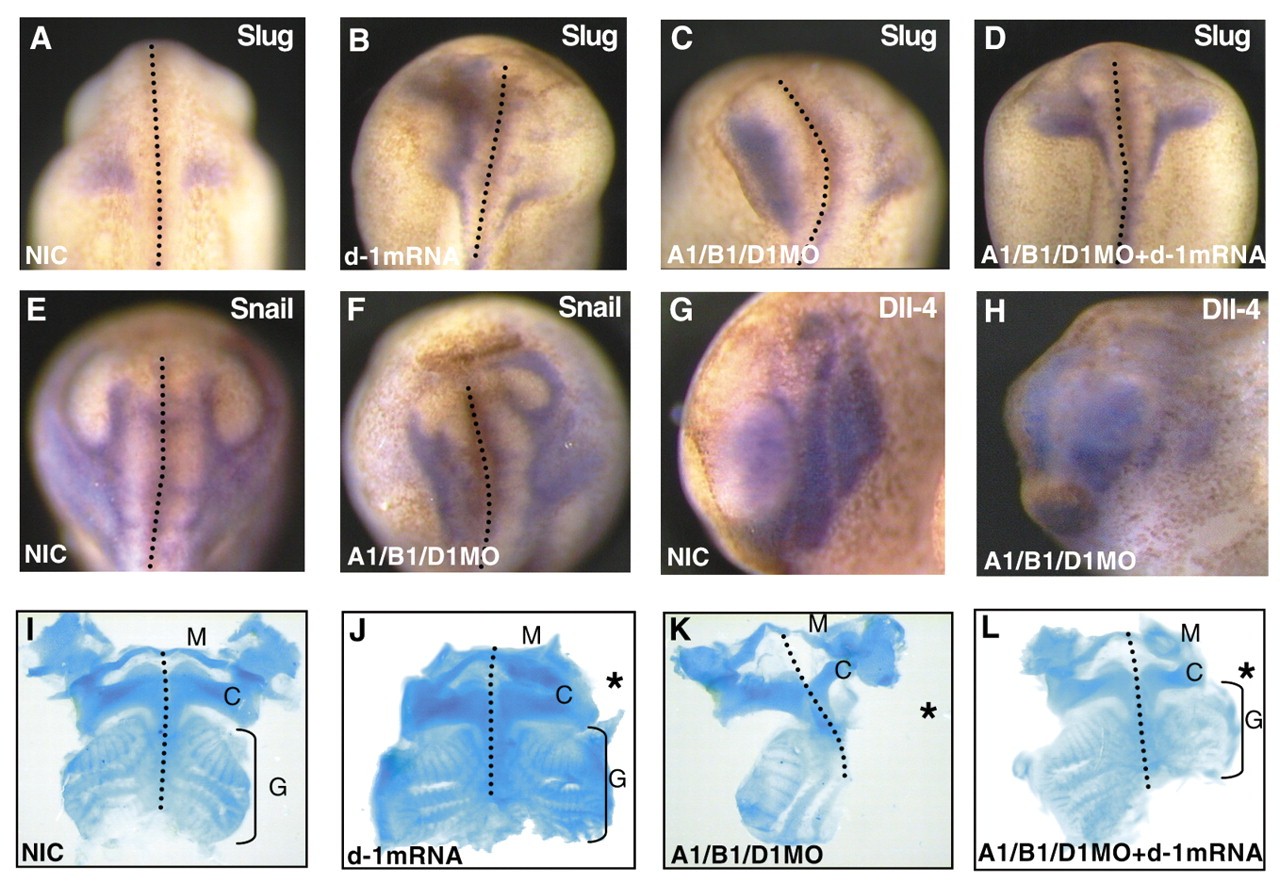 Fig. 9. Knockdown of all three PG1 genes affects the development of neural crest and its derivatives. Non-injected controls (NIC; A,E,G,I) and embryos injected on the left-hand side with Hoxd1 MO insensitive mRNA (B,J), all three Hox PG1 morpholinos (A1/B1/D1MO; C,F,H,K) or a combination of both (D,L) were analyzed for neural crest gene expression, or stained with alcian blue to show the craniofacial structures. The embryos shown in A-F are early tailbud stage embryos shown from the dorsal side with anterior to the top. With the PG1 MOs, neural crest cells fail to migrate away from the hindbrain, as shown by Xslug (C: 86%, n=29) and Xsnail (F: 100%, n=14) expression. This is rescued (22% of embryos with restricted Xslug expression, n=9) by Hoxd1 overexpression (D) and simple overexpression leads to an expanded Xslug domain (B: 100%, n=10). Slightly later tailbud embryos analyzed for dll4 are shown from the left-hand side, with anterior to the left, and in the triple PG1 knockdown dll4 expression in the branchial arches is restricted to close to the hindbrain (50%) or completely lost (G,H: 44%, n=16). Alcian blue was used to stain the cartilage of stage 49, embryos (I-L) shown from the ventral side to show the craniofacial structures (injected side on the right:*). The complete gill area is missing in the triple morpholino injected embryos (K: 82%, n=11) and this is rescued (26% of embryos with missing gill, n=19) when Hoxd1 mRNA is co-injected (L). C, ceratohyal; G, gill cartilage; M, Meckel's cartilage. Dotted line indicates midline.