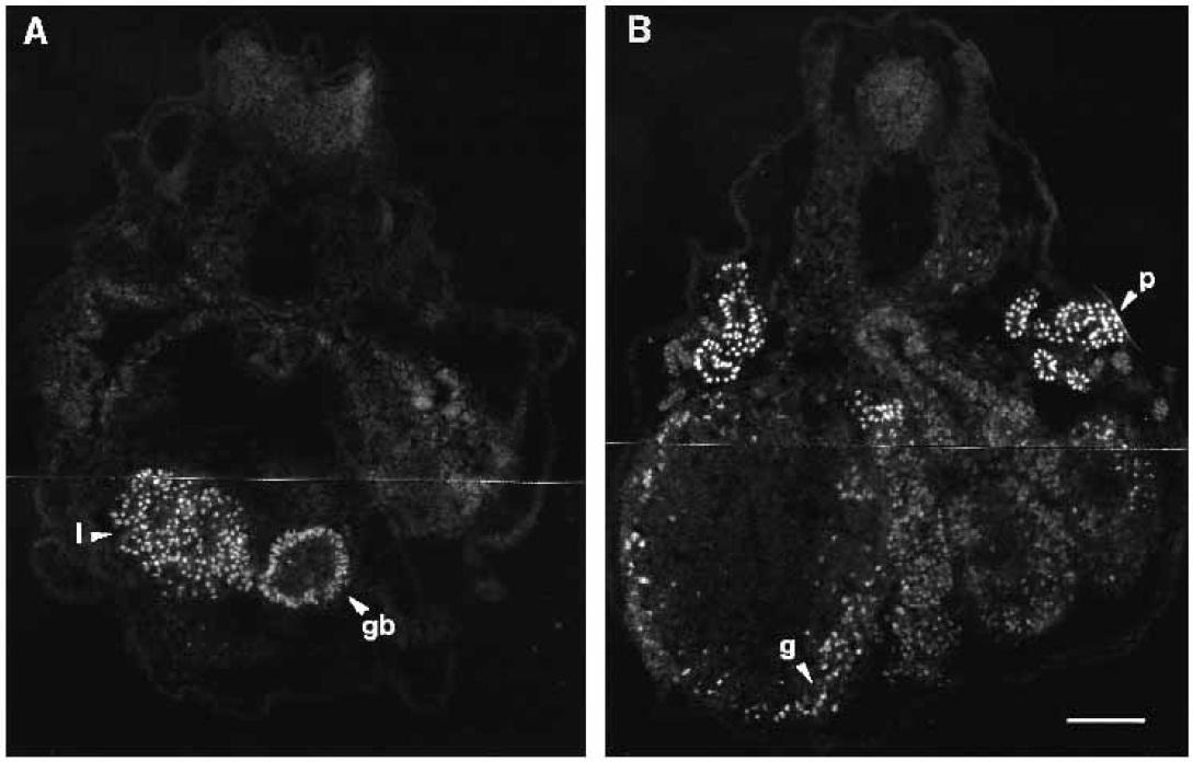 specific staining in the liver (l), gall bladder (gb), pronephric tubules (p) and the epithelial cells of