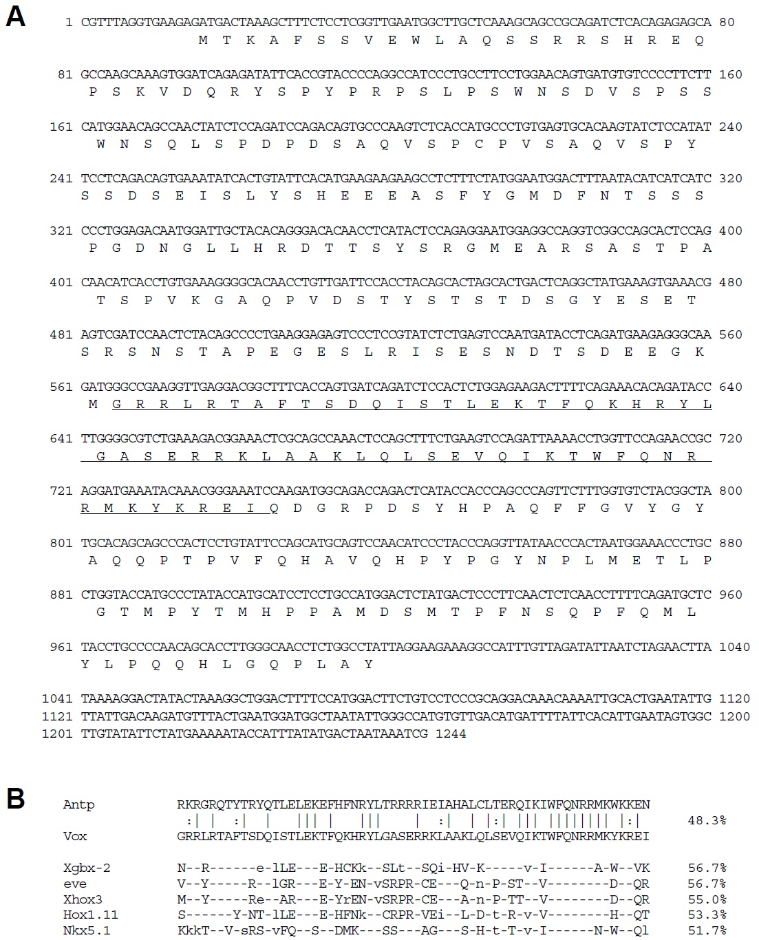 Fig. 1. The Xenopus Vox sequence. (A) The nucleotide and predicted amino acid sequence of Vox.