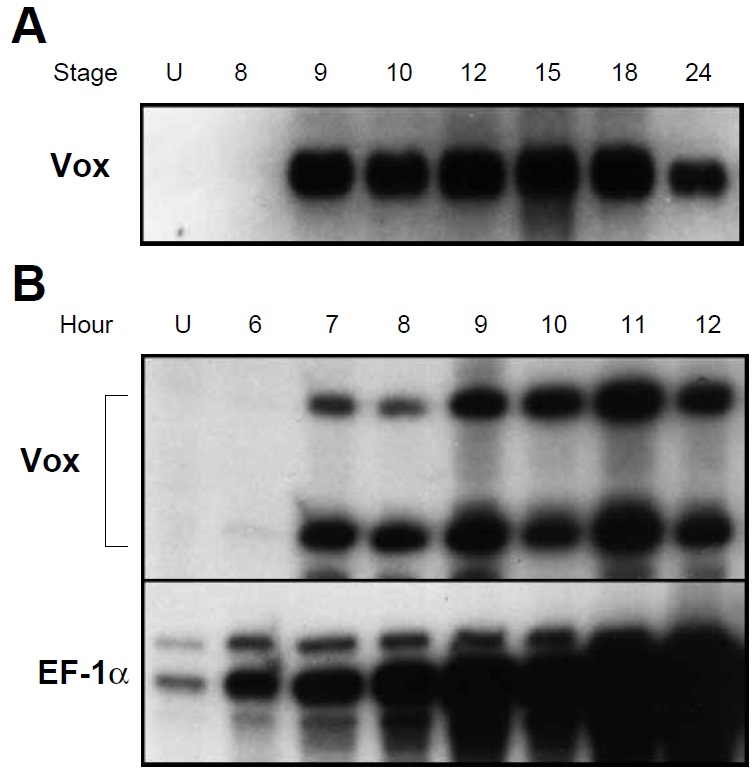 Fig. 2. Temporal expression of Vox. (A) Northern analysis of the