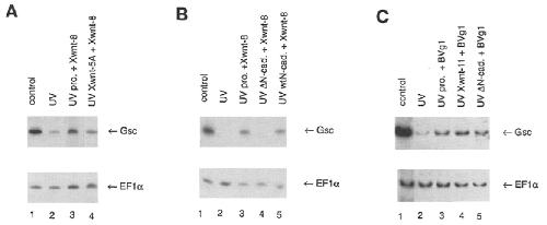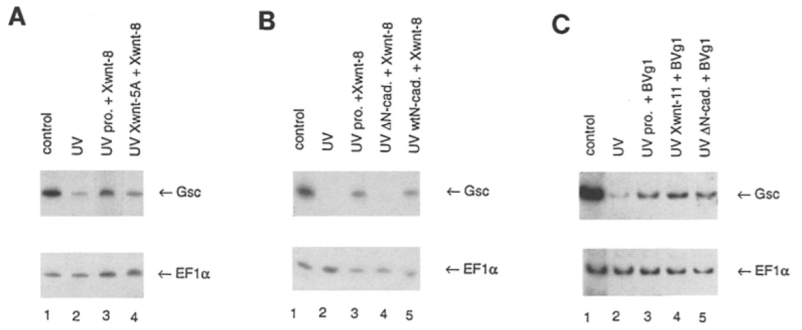 (C). (Lane 4) UV-irradiated embryos injected with Xwnt-5A (A), AN-cadherin (B), or Xwnt-ll (C) RNA followed by Xwnt-8 (A and B)