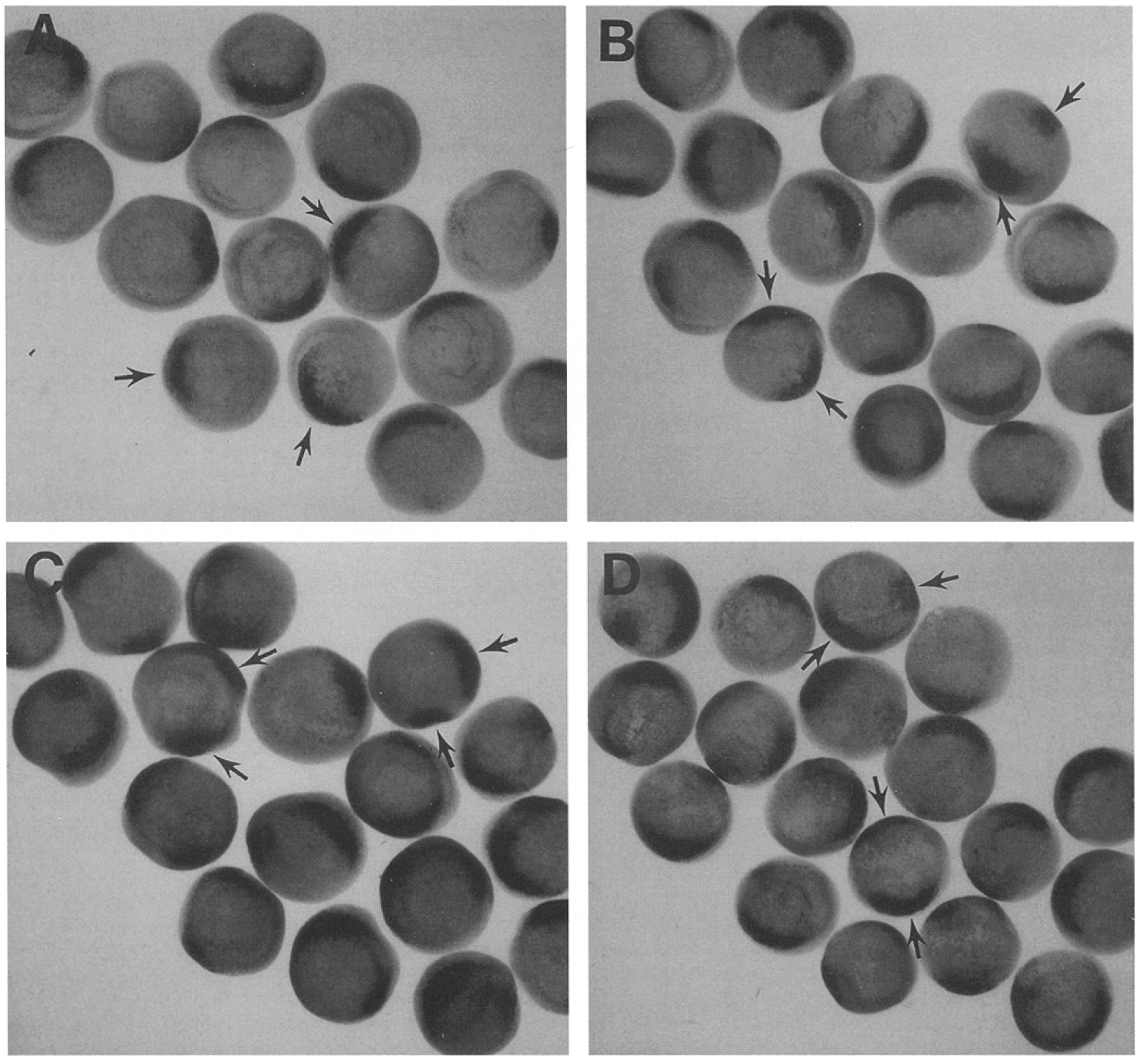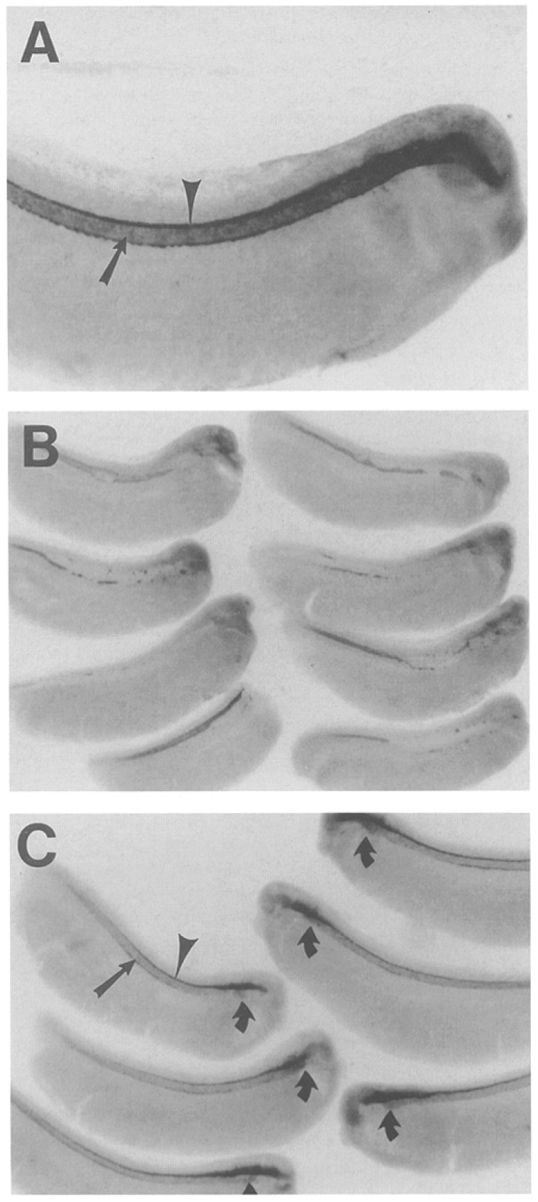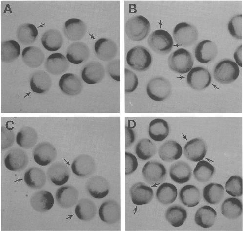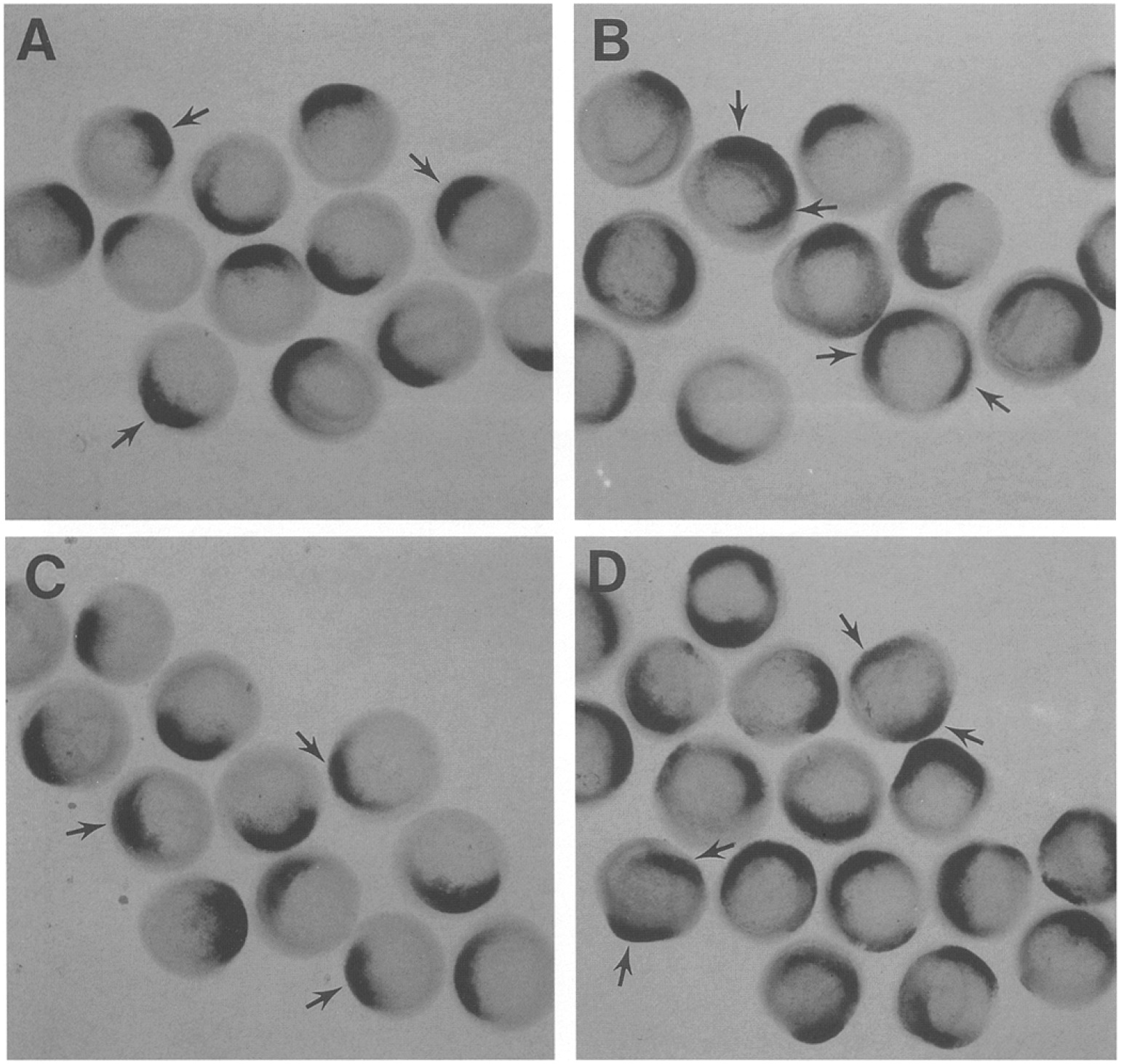 (D) RNA followed by BVgl RNA also possess multiple sites of gsc expression. (Arrows) Sites of gsc expression.
