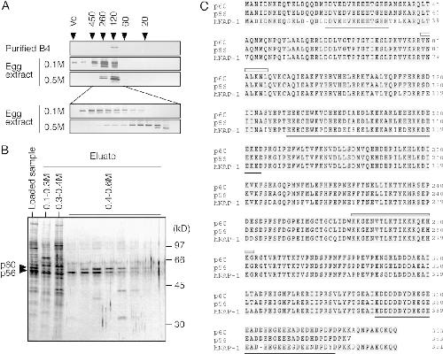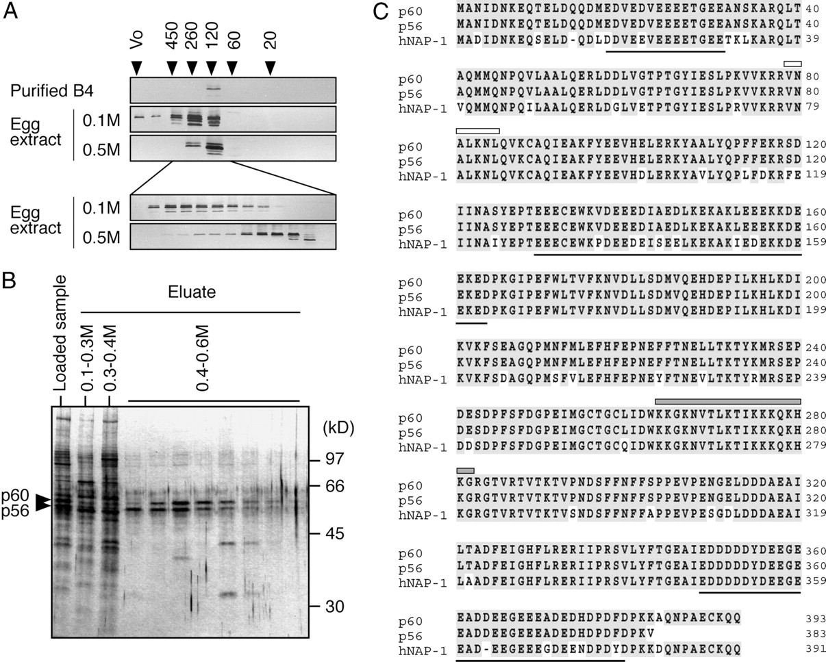 Figure 1. dentification of the B4-binding acidic protein in Xenopus eggs. (A) The B4 protein purified from Xenopus eggs and the soluble fraction of Xenopus egg extract were gel-filtrated on a Superose 12 column in physiological buffer (0.1 M) or high-salt buffer (0.5 M), and fractions were immunoblotted with Ab specific for B4. The position of elution for marker proteins is indicated at the top. (B) The gel-filtration fraction (0.1 M) containing B4 was treated with anti-B4 Ab beads, then B4-binding components were eluted from the beads by high-salt buffer, loaded onto a Mono Q column, and eluted by a linear gradient of 0.1–0.6 M KCl. (C) Alignment of the predicted peptide sequences of the p60 and p56 B4-binding proteins and human NAP-1 (hNAP-1) with identical residues shaded. The identity between p60 and hNAP-1 is 88%. Acidic segments are underlined, and putative nuclear localization and nuclear export signals are indicated by shaded and open bars, respectively.