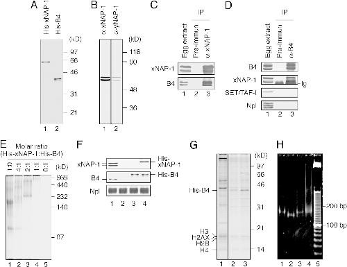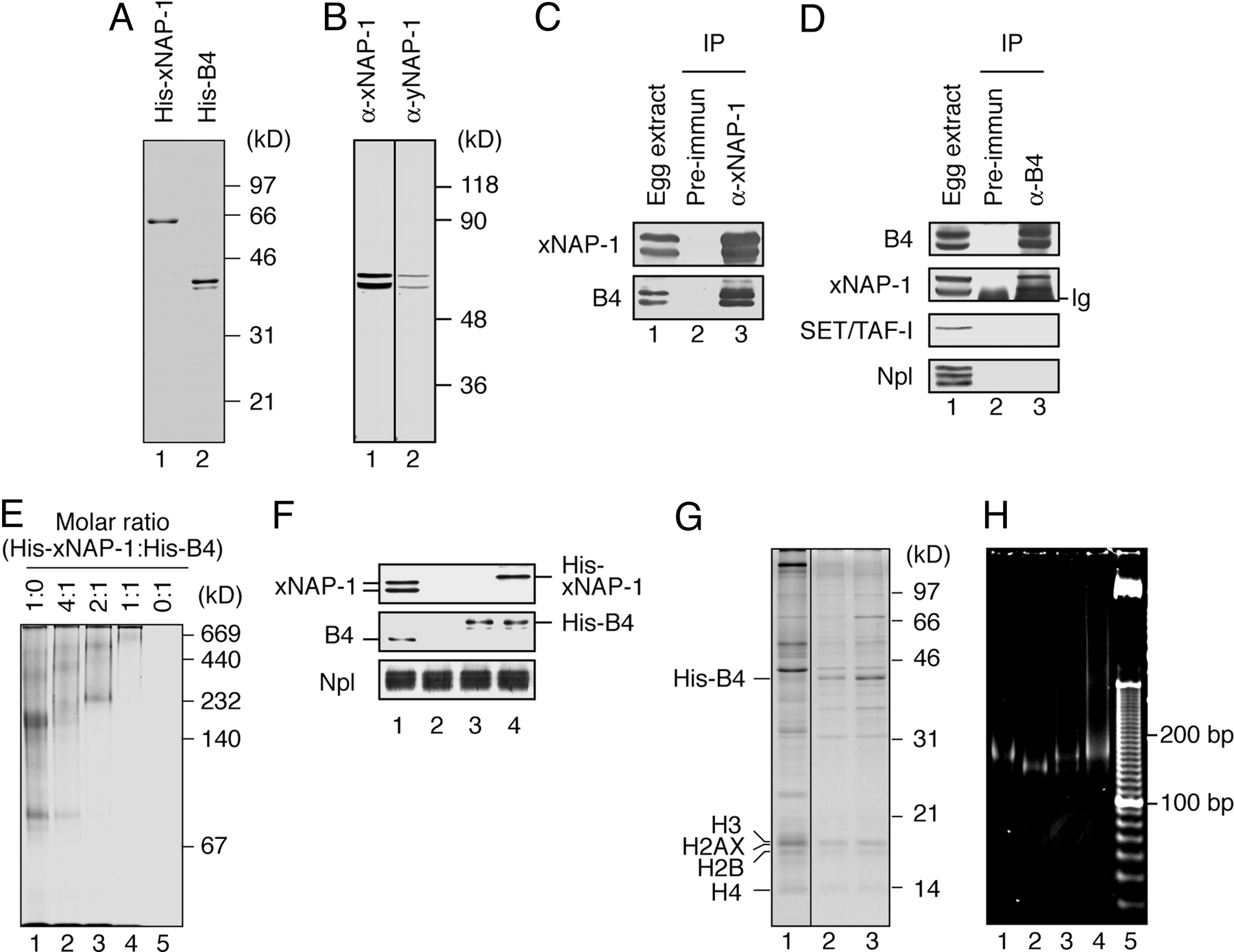 Figure 2. The remodeling of Xenopus sperm chromatin into nucleosomes in egg extract with and without xNAP-1. (A) Histidine-tagged recombinant proteins of p60 xNAP-1 (His-xNAP-1, lane 1) and B4 (His-B4, lane 2) were produced in E. coli and purified. (B) On immunoblotting of egg extract, Abs raised against His-xNAP-1 detected specifically p56 and p60 xNAP-1 (lane 1), and these bands were also recognized by Ab for yeast NAP-1 (lane 2). (C) Anti-His-xNAP-1 Abs precipitated p56 and p60 xNAP-1 from egg extract, along with B4 (lane 3). (D) Anti-B4 Abs coprecipitated xNAP-1 but neither nucleoplasmin (Npl) nor SET from egg extract, along with B4 (lane 3). Distinct bands of nucleoplasmin are due to the difference in the phosphorylation state. (E) His-xNAP-1 and His-B4 were mixed in physiological buffer at various ratios and electrophoresed on a native-polyacrylamide gel. (F) Egg extract was mock-depleted with control Ab beads (lane 1) or immunodepleted of both xNAP-1 and B4 (lanes 2–4) with anti-xNAP-1 and B4 beads, then reconstituted with free His-B4 (lane 3) or the His-B4/His-xNAP-1 complex (lane 4). Npl (nucleoplasmin) is used as a dilution control. (G) SDS/PAGE analysis of acid extracted proteins from sperm chromatin incubated in egg extract where the xNAP-1/B4 complex has been depleted (lane 1) or replaced by the His-xNAP-1/His-B4 complex (lane 2) or His-B4 (lane 3). (H) Micrococcal nuclease digestion assay of sperm chromatin incubated in the egg extracts where the xNAP-1/B4 complex has been mock-depleted (lane 1), immunodepleted (lane 2), or replaced by the His-xNAP-1/His-B4 complex (lane 3) or His-B4 (lane 4).
