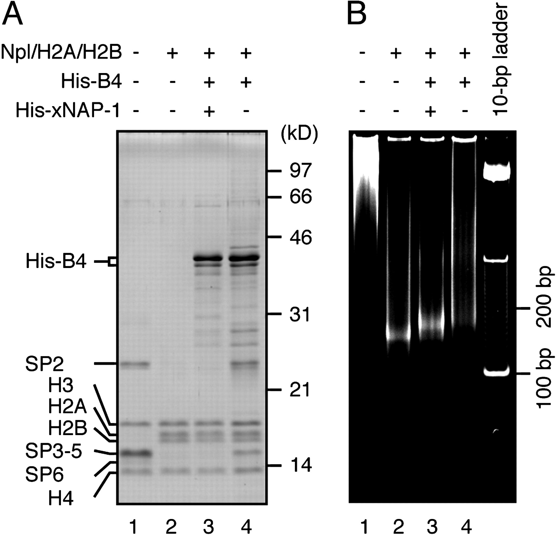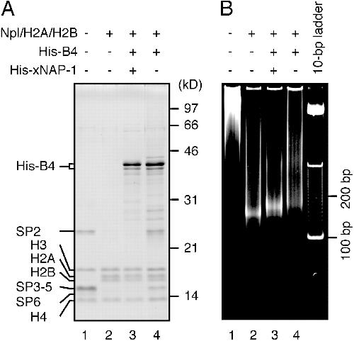 Figure 3. The remodeling of Xenopus sperm chromatin in the in vitro reconstitution system. (A and B) Demembranated Xenopus sperm (lane 1) were incubated with the nucleoplasmin/H2A/H2B complex (lane 2) or this complex plus either the His-xNAP-1/His-B4 complex (lane 3) or His-B4 (lane 4). Protein composition and basic structure were examined by SDS/PAGE of acid extracted proteins (A) and micrococcal nuclease digestion (B), respectively.