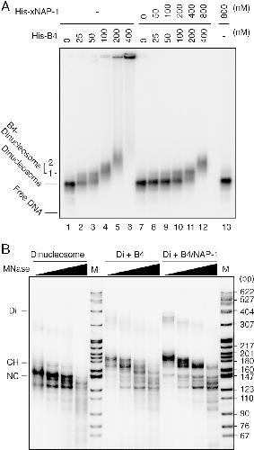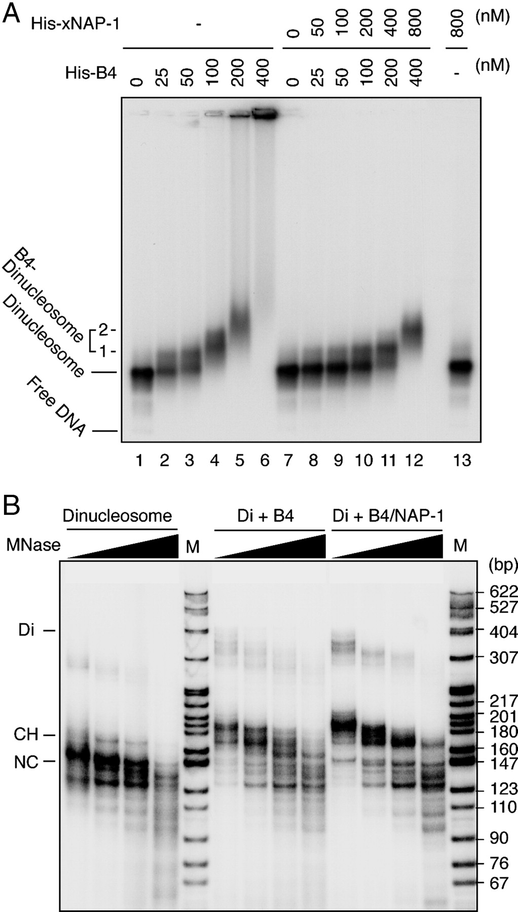 Figure 4. Facilitation by xNAP-1 of the physiological deposition of B4 onto dinucleosomes. (A) Various concentrations of free B4 (lanes 1–6), the His-xNAP-1/His-B4 complex (lanes 7–12), was added to dinucleosomes, and the binding of the linker histones was examined by the mobility shift of dinucleosomes on agarose gel electrophoresis. The positions of free DNA, dinucleosomes, and dinucleosomes incorporating one (1) and two (2) molecules of the linker histone are indicated. (B) Micrococcal nuclease (MNase) digestion of B4-incorporated dinucleosomes. Dinucleosomes, which had incorporated none (Dinucleosome) or two molar equivalents of B4 in the absence (Di + B4) or presence of His-xNAP-1 (Di + B4/NAP-1) were digested with increasing amounts of micrococcal nuclease. The positions of DNA fragments of dinucleosomes (Di), chromatosome (CH), and nucleosome core (NC) are indicated. M, MspI-deigested pBR322 size marker.