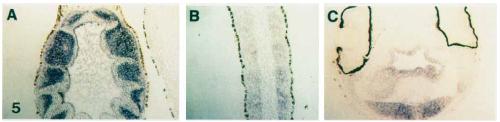 dorsal section of the embryo in B shows hybridization in the neural tube