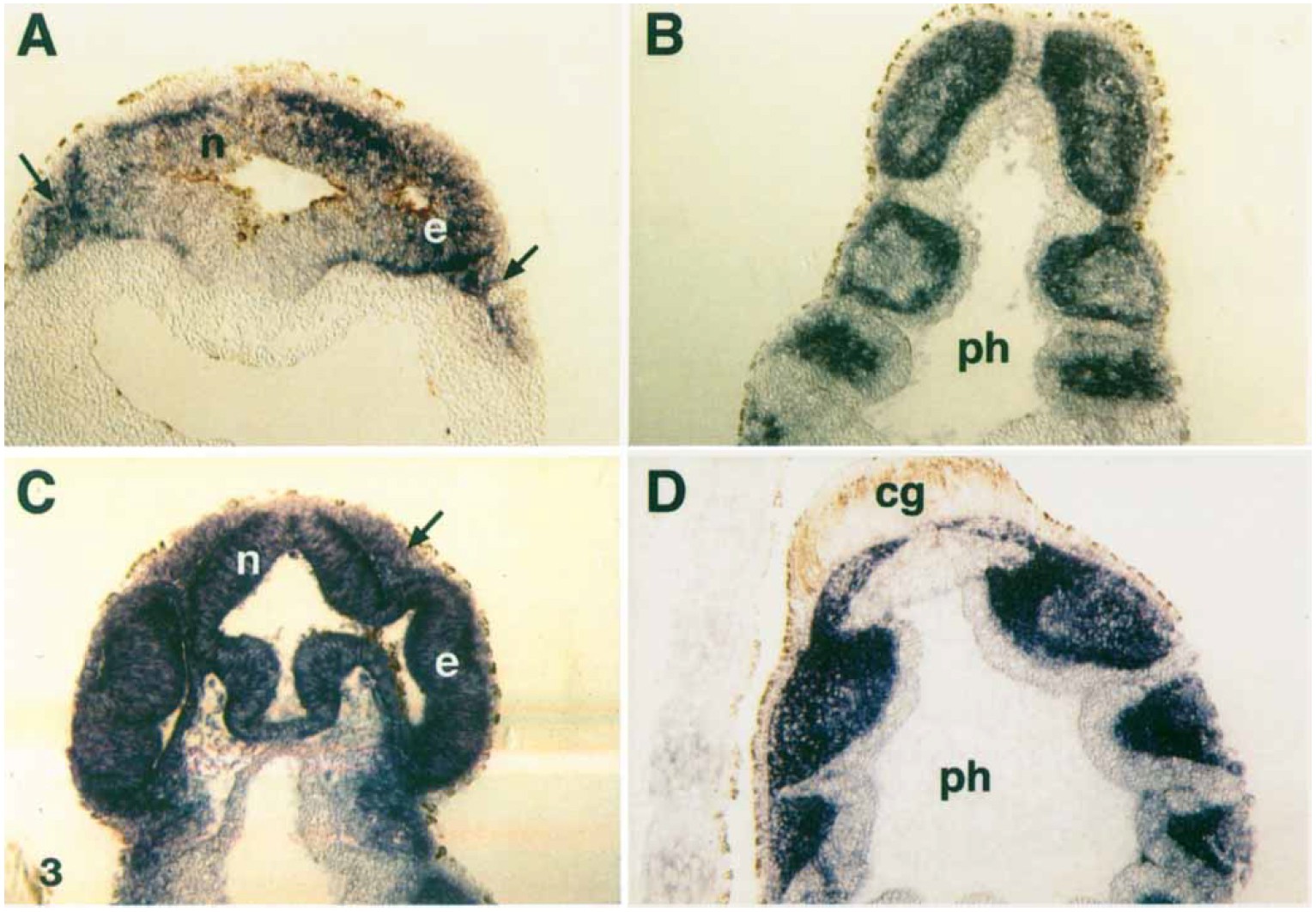 (n). eye vesicle (e), and neural crest (arrow). D: Expression is also seen