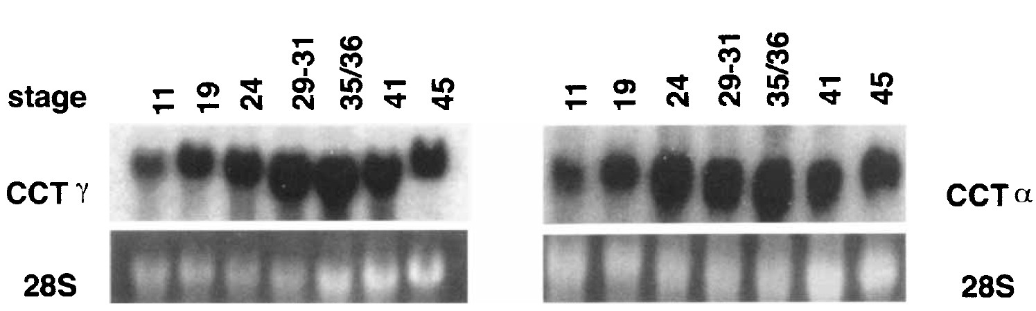 Fig. 6. Northern analysis of CCTy and CCTa transcripts. Total RNA from staged Xenopus embryos was