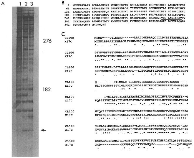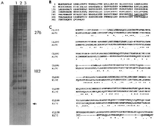 Fig. 1. Isolation of X17C cDNA by differential display, and deduced amino acid sequence of X17C protein. (A) Display of amplified cDNAs on a denaturing polyacrylamide gel. The cDNA were derived by RT-PCR, using arbitrary primers (see Experimental procedures) from stage 13 embryos treated as follows: (I) control untreated; (2) retinoic acid treated; (3) retinoic acid plus cycloheximide treated. The arrow indicates the initially-isolated X17C cDNA fragment. The approximate positions of markers at 182 and 276 nucleotides are indicated. (B) Deduced amino acid sequence of the XI7C protein. (C) Comparison of X17C with the CLlOO MAP kinase phosphatase (Clustal V program).