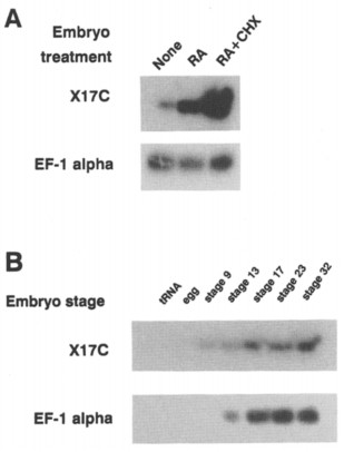 Using a differential display strategy, we have isolated a cDNA corresponding to a mRNA which is induced by retinoic acid treatment of late gastrula Xenopus embryos, and much more strongly induced by retinoic acid and cycloheximide. The cDNA, designated X17C, encodes a novel mitogen-activated protein (MAP) kinase phosphatase of 378 amino acid residues which is only distantly related to other known MAP kinase phosphatases. In normal embryogenesis, the X17C mRNA is expressed after the midblastula transition and accumulates during gastrulation. In neurula and tailbud stage embryos the mRNA is localised in two domains, one in the anterior region of the embryo, and one at the tail tip. When expressed from synthetic mRNA injected into oocytes, the X17C protein is found within the cytosolic fraction and not in the nucleus. The X17C protein dephosphorylates and inactivates Xenopus MAP kinase in oocytes stimulated to undergo maturation by progesterone. We indicate the application of X17C as a tool for interfering with MAP kinase signaling in somatic cells of embryos, using FGF receptor-mediated MAP kinase activation in animal cap explants.