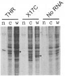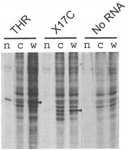 Fig. 5. Cytoplasmic localisation of X17C protein expressed in injected oocytes. Oocytes were injected either with 5 ng X17C mRNA, or with 5 ng Xenopus thyroid hormone receptor mRNA. The thyroid hormone receptor (TRal) is known to be concentrated in the nucleus (Old et aI., 1992). Oocytes were radiolabelled as described in Fig. 4, and were enucleated manually to generate nuclear and cytoplasmic fractions. Extracts of whole oocytes, cytoplasms, or nuclei are represented by w, c and n, respectively.