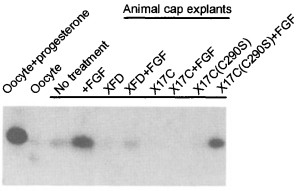 Fig. 7. Effect of overexpression of X17C upon MAP kinase activation in response to bFGF in animal cap explants. Wild-type or phosphatase-dead X17C was expressed in embryos by injection of 2.5 ng of synthetic mRN A into fertilised eggs at the two cell stage. Where indicated, embryos were injected with synthetic mRNA encoding a dominant negative FGF receptor, XFD (Amaya et aI., 1991). Animal cap explants were taken at stage 8, and treated with bFGF (50 nglml) for 7.5 min, where indicated. The explants were then homogenised and analysed for MAP kinase activity by the in-gel assay.