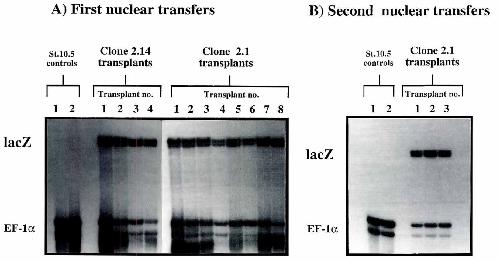 transplant; both showed a strong lacZ signal in the PCR assay. The presence of the lacZ signa! in nuclear transplants indicates stable transmission of