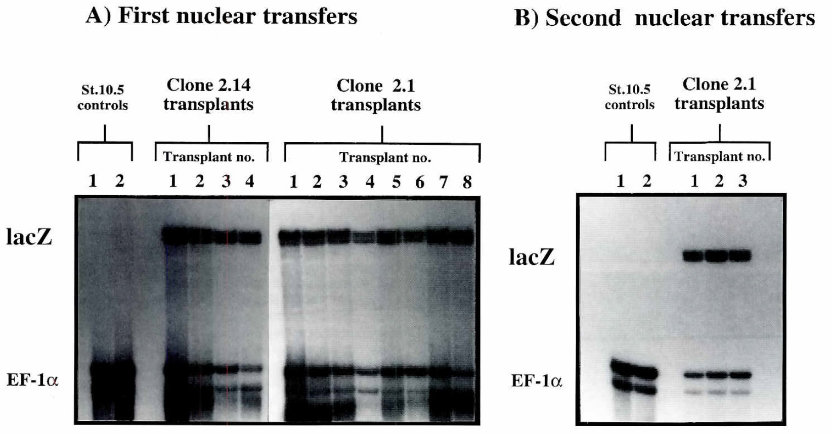 the lacZ transgene from donor nuclei to nuclear transplant embryos. Primers specific to the endogenous EF-la gene served as internal controls for