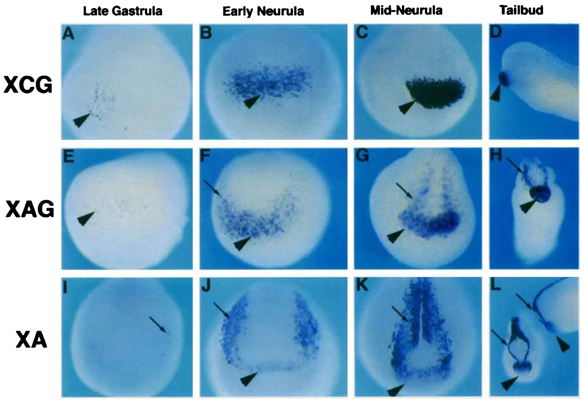 Fig. 2. Developmental time course of three cement gland markers in Xenopus. In situ hybridization analysis using digoxygenin labeled antisense probes hybridized to a developmental series of whole Xenopus embryos. XCG (A-D) and XAG (E-H) (Sive et al., 1989) transcripts are first detected at late gastrula, in dispersed cells within the outer layer of the dorsal ectoderm, just anterior to the presumptive neural plate (A, E). XCG is detected in presumptive cement gland cells only, whereas XAG is detected in cement gland cells (arrowheads) and more weakly in the adjacent, posterior hatching gland cells (arrows). XA transcripts (CL) (Sive et al., 1989) are initially detected at late gastrula stage in the hatching gland primordium (I), and then at early neurula stage, in the cells of the posterior cement gland (J). Refer to Cement Gland Anatomy: Morphology and Molecules in the text for discussion of these data. In situ hybridization method adapted from Harland (1991).