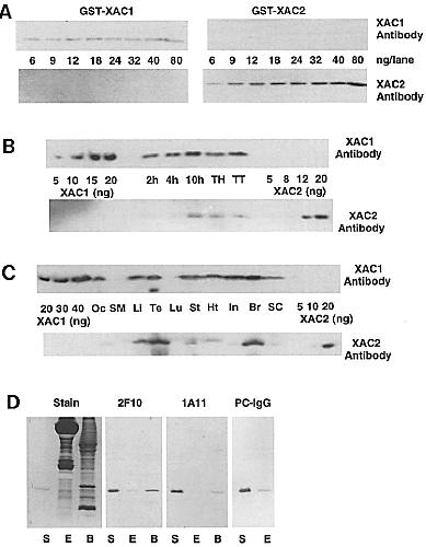 tested against XAC1 stan-dard (S) and extracts of Xenopus stage 21 embryos (E) and adult brain (B). Coomassie blue-stained gel (Stain) and Western blots are shown. XAC1 standard was prepared by thrombin cleavage of GST-XAC1.